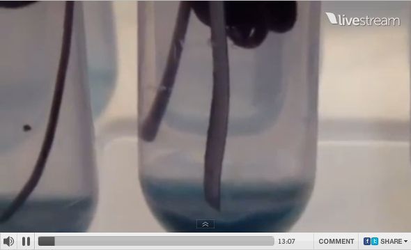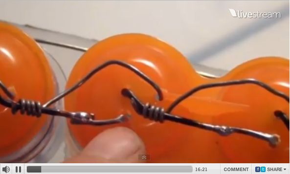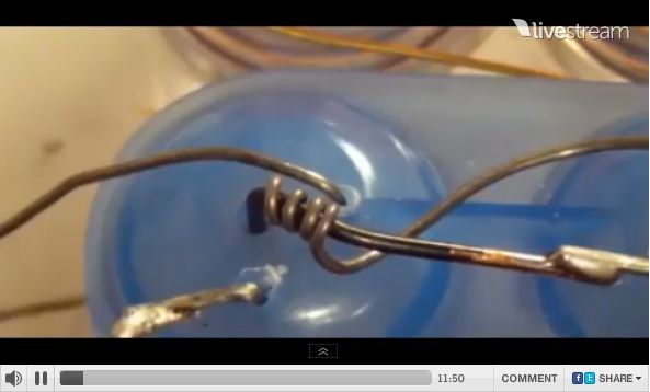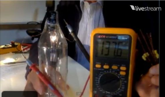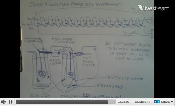 ケッシュ財団のティーチング・ルームへようこそ、今日初めてここにカメラを入れた。(48:12)これはキャパシターでナノ・ワイヤーはチャージされている。キャパシターをコカコーラボトルで覆ったのは、ナノ・マテリアルが吸収できるレベルまで減少された場の環境を作るためだ。