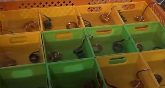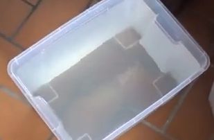 プラスチックの網の上に銅線を並べて、完全に浸るくらいの分量の沸騰したお湯を注ぐ。苛性ソーダの反応でお湯の温度が上昇する。ナノコーティングが始まるのに適切な環境を作るために蓋を閉めて、約一日そのままにしておく。(このビデオでは、すでにナノコーティングされた銅線を再度コーティングしている。)