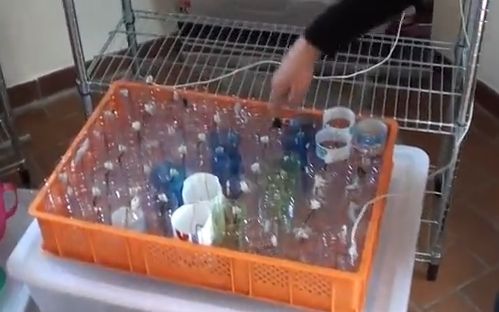 別のプラスチック容器を用意して底に金属の網を敷く。最初に使われた容器内に残った液体を少量この容器内に移す。繋がっているワイヤーをプラスチックの枠に格子状に渡し、容器上部に設置し、ナノコーティングされた銅線を格子状のグリッドに吊るす。