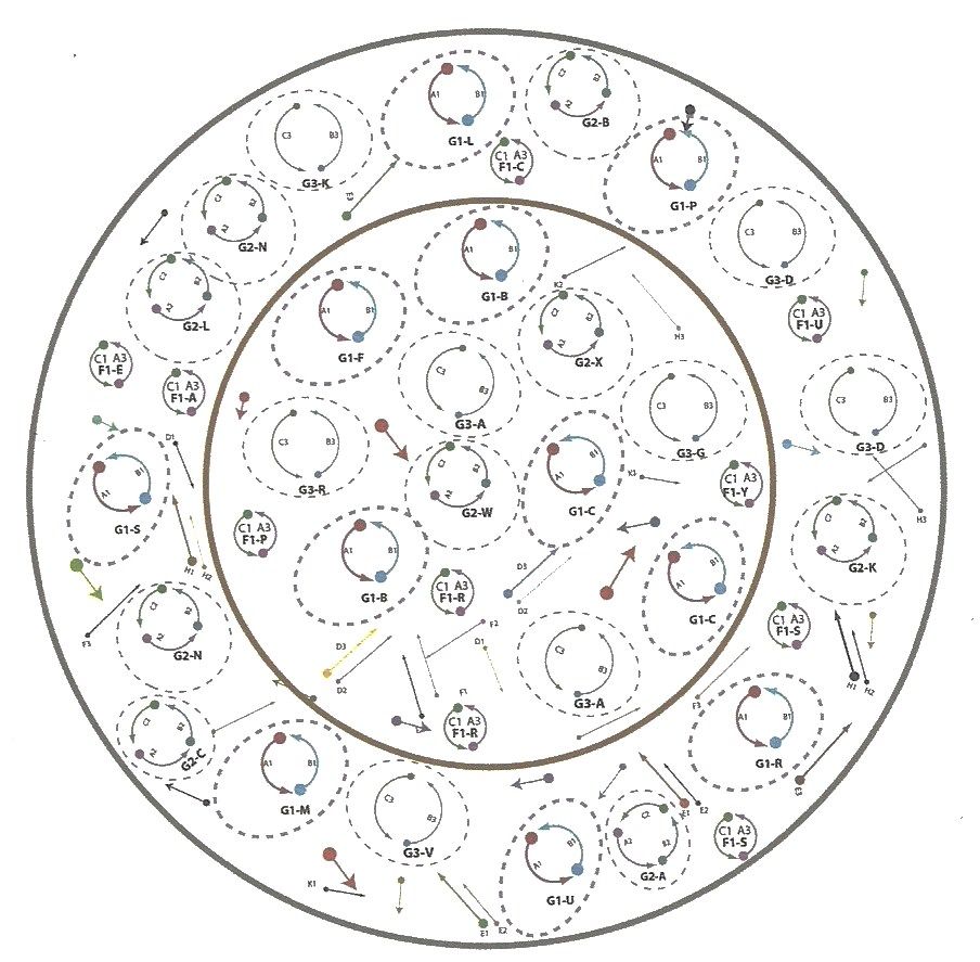 この重力磁場ポジショニング(グラポス)では、リアクターの中心コアに放出された各プラズマ磁場は、同じコア内 で強度が適合した他のプラズマ磁場と相互作用する。それらは、同じリアクター内の他のコア内に存在する同様のプラズマ磁場の集まりと集合的に相互作用し、他のコア 内 のプラズマ磁場と結び付く。これがリアクター内部と周辺に同時に重力磁場を生み出す。(図28)