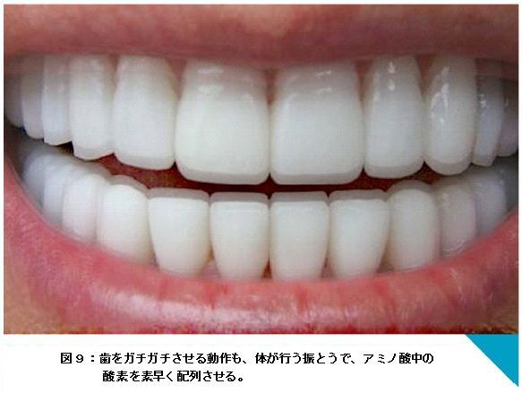 もう一つの、体内での自然な振とう法は、体温が急激に下がったり、熱で上がった時に起こる、歯をガチガチさせる動作だ。このプロセスは血液の振とうを加速させ、人の体内のより重い元素を再編成させる。(図9)