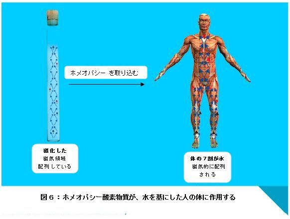 実際、ホメオパシーとは水 / アルコール中に、再配列された酸素をもつ物質の磁場に、細胞が再配列されることだ。この過程でアミノ酸の分子 (HCNO) 中の酸素が本来のレベルに戻る。〔図6〕