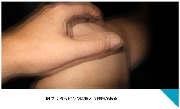 体が物により衝撃を受けると、急激な圧迫が局部的な傷みを与える。タッピングのテクニックを知っている人は、痛む箇所あるいは、そのまわりに軽いタッピングをする。すると、ほとんどの場合、痛みは和らぎ、すっかり取り除かれる。(図7)